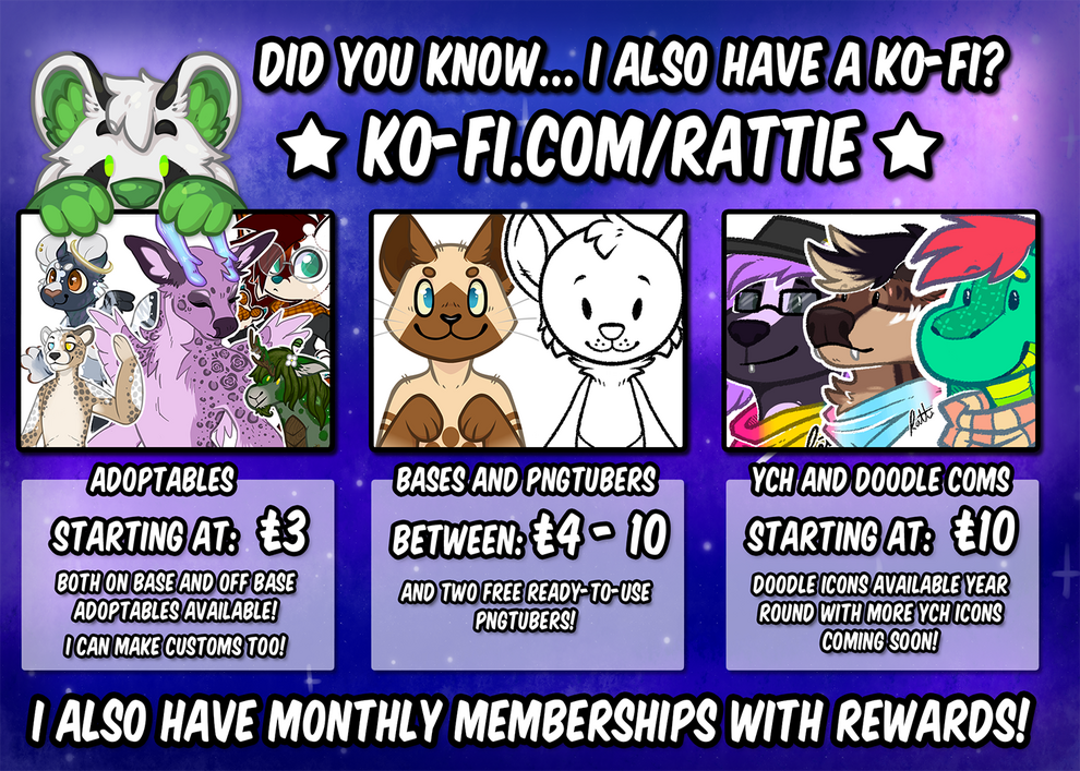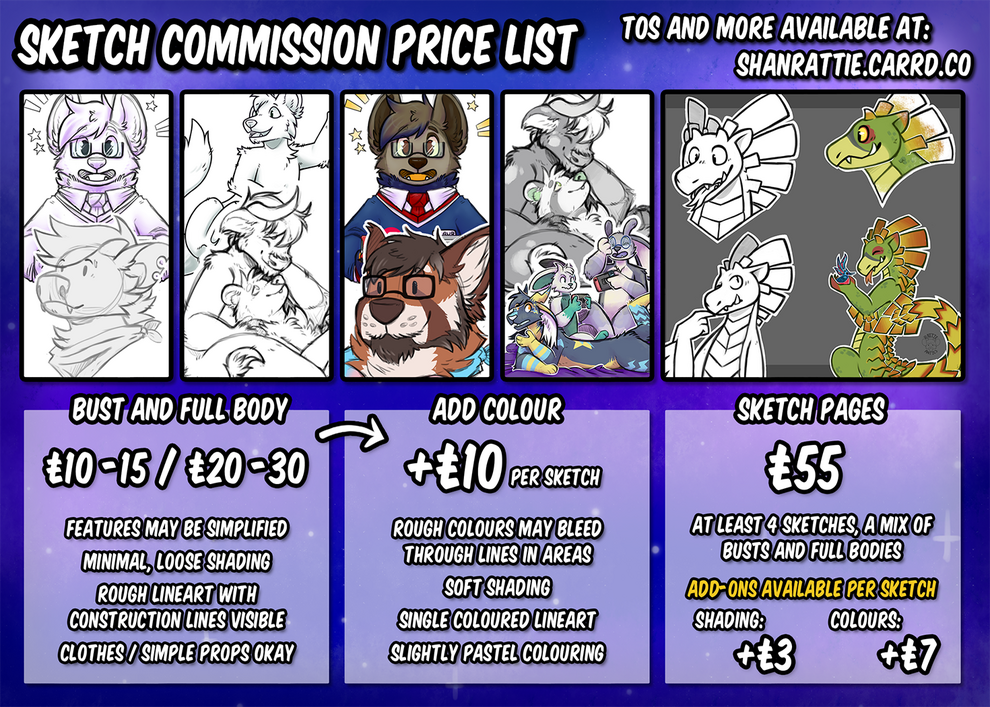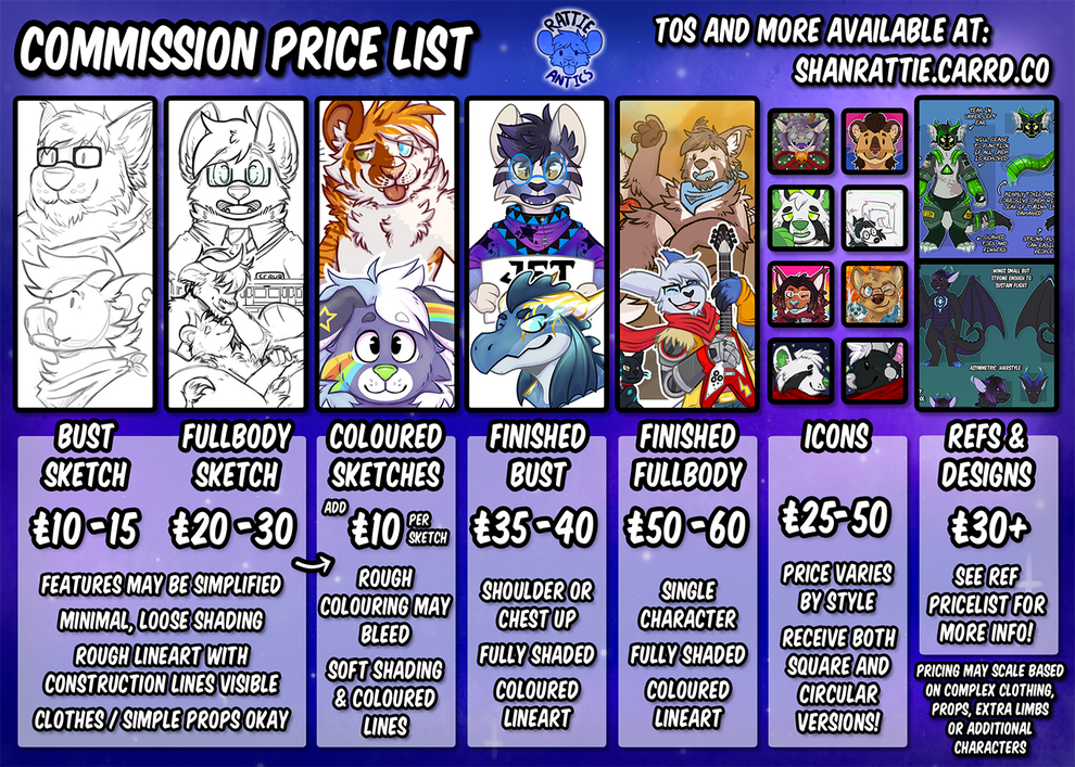 SFW furry artist and Character designerBelow are my basic price sheetsTo inquire about commissions or to discuss your idea further for a quote please read my ToS and then contact me at one of the links below! 🦝🐭